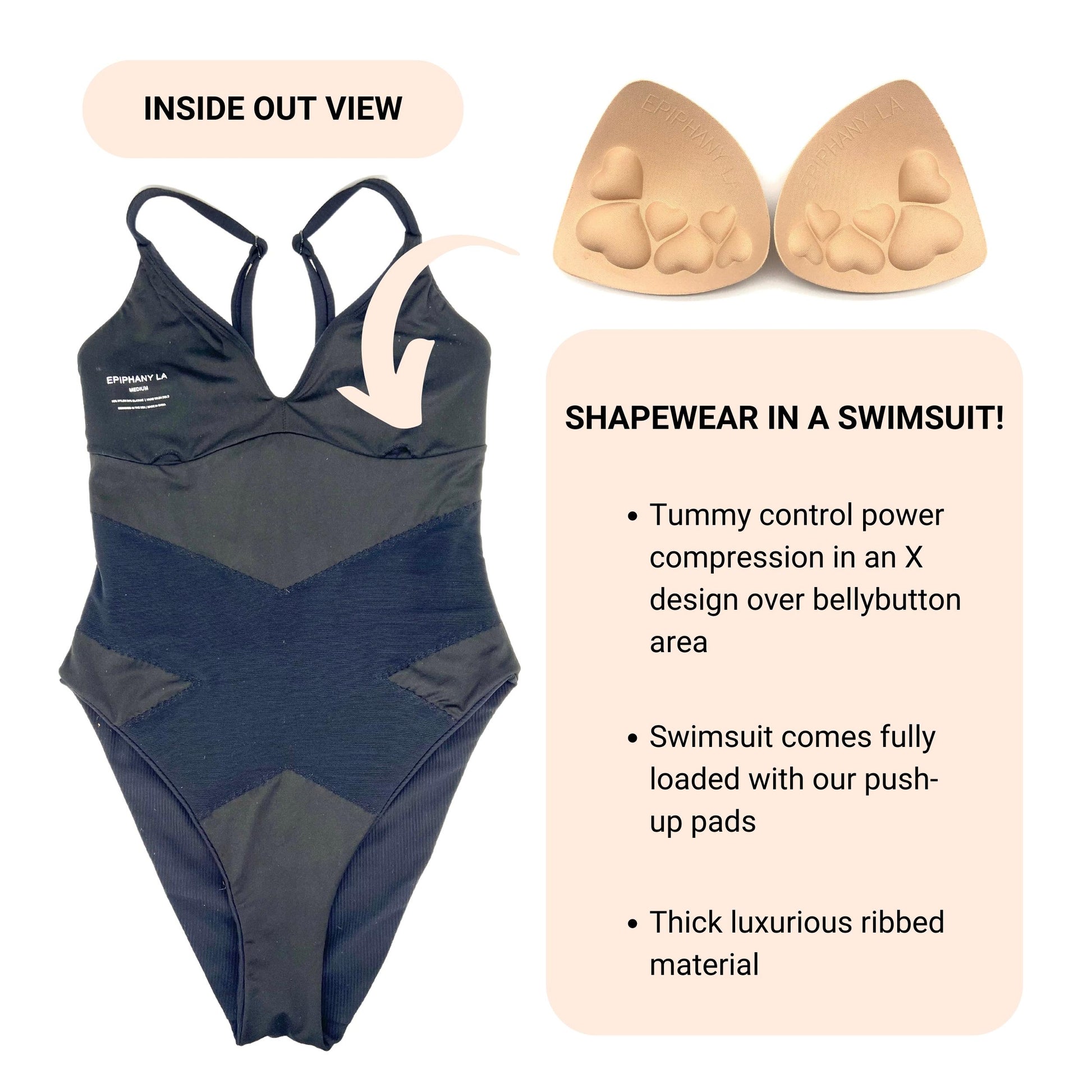 - BUILT-IN SHAPEWEAR: Shapewear in a swimsuit? Yes please! This swimsuit features THREE layers of compression material in an X design over the bellybutton to give you ultimate tummy support and shaping.